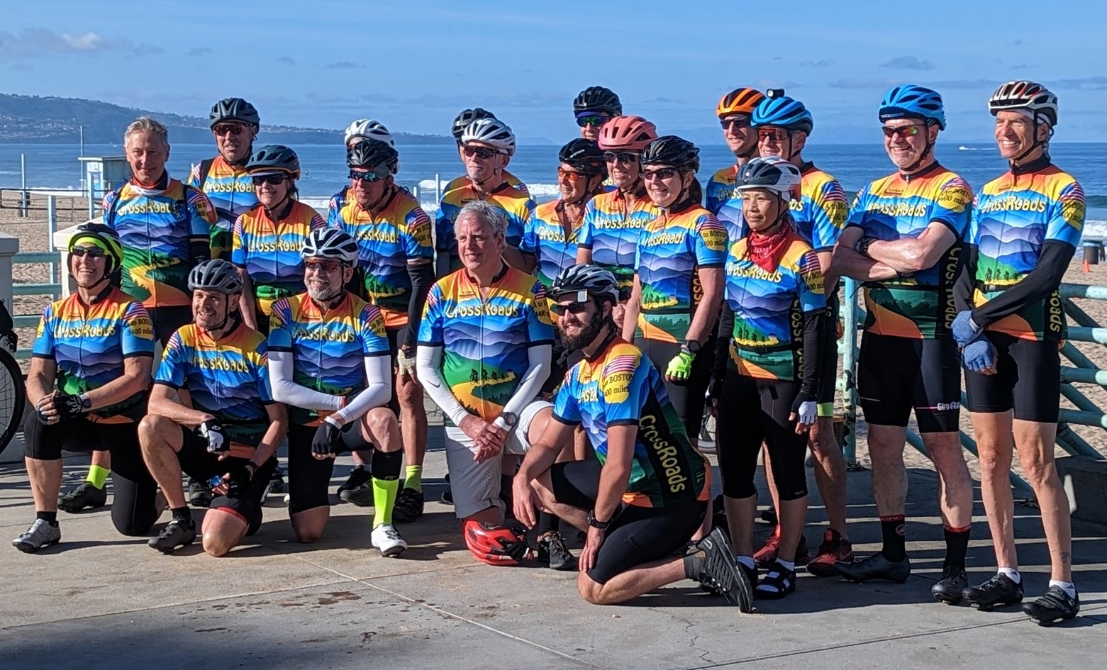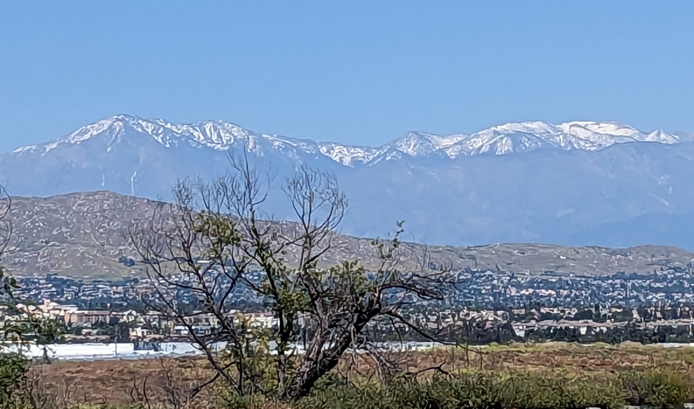 Today was a great first day, an 87 mile ride to Moreno Valley, California. The temperature was mostly in the 60s, the wind was behind us, and the Sunday traffic was not so bad. After the wheel dip in the Pacific at Manhattan Beach we headed east. It’s easy to forget how much industry Los Angeles has other than entertainment. We saw lots, from space and aviation companies to refineries to factories. Then we climbed into the orange groves, their trees loaded with fruit. Lastly the snow capped San Bernadino mountains came into view.