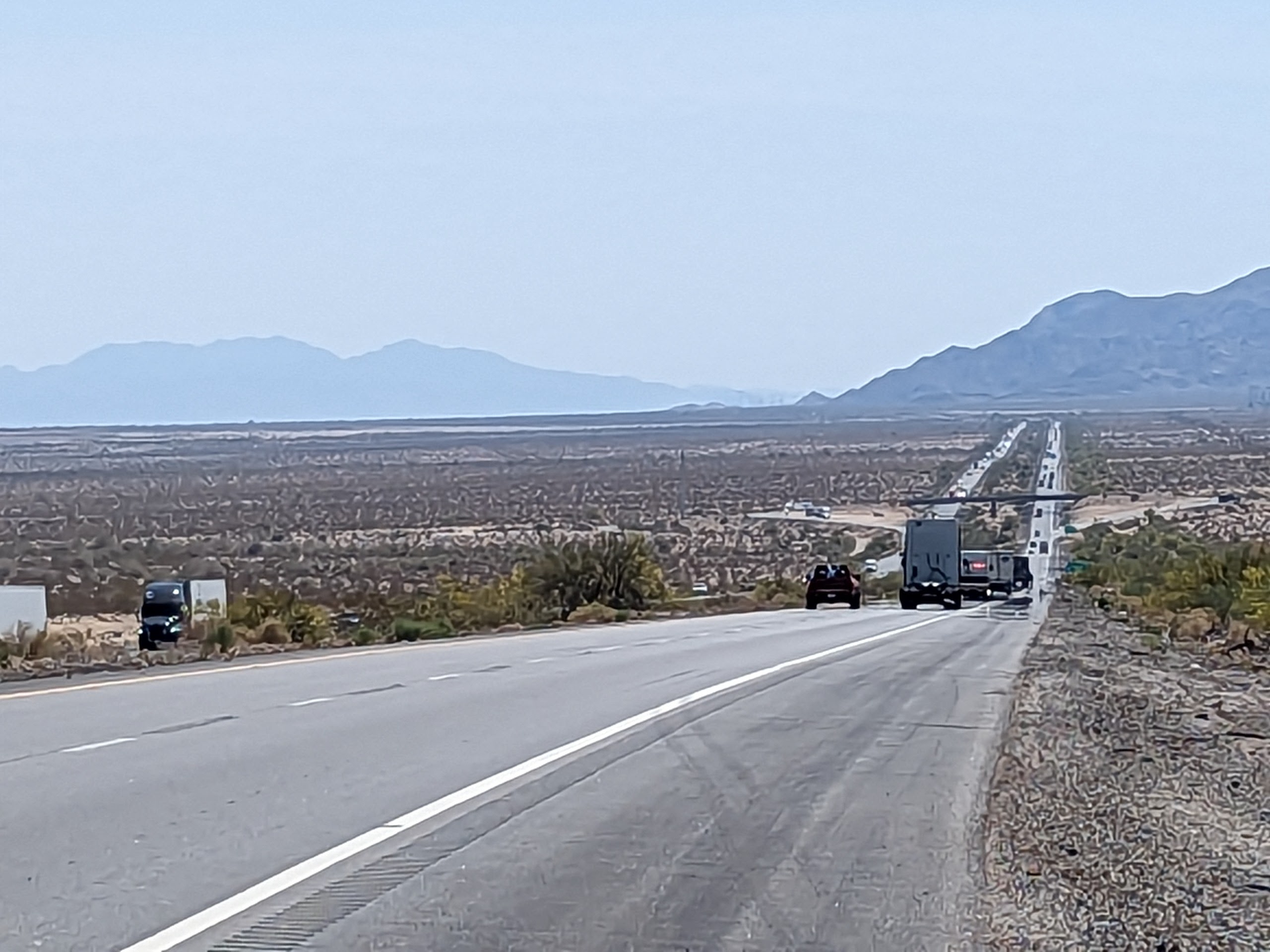 97 miles through the desert today, from Indio to Blythe, California. Not a lot of climbing, and even fewer turns. Riding on the Interstate was really not bad. The road is good with consistent 12′ shoulders. Riding 10 feet away from a semi going 70 feels a lot safer than riding 3 feet from a pickup going 45 (either can kill you). The truckers were consistently courteous, moving into the left lane when possible. This being California, someone often took advantage of the chance to pass on the right.