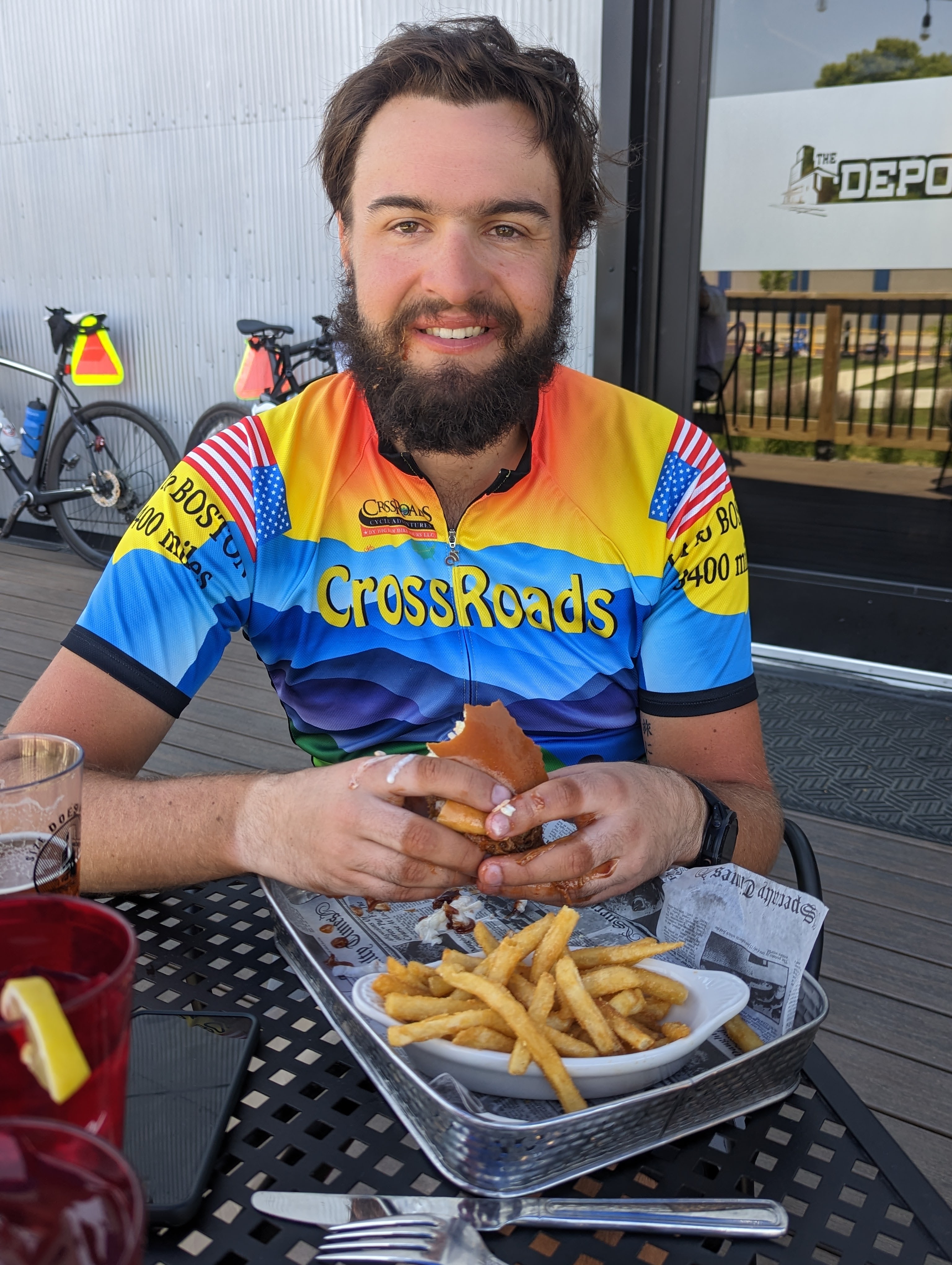 Chad had one of the sloppiest sandwiches ever, then it was on to the hotel for bike repairs. As we all remember from Day -1, I had a frayed shifter cable on the rear derailleur which had to be replaced. Today coming out of the SAG stop the other cable broke. It couldn’t be fixed on the road so I spent most of the day pedaling furiously in low gear. Tonight I got a new cable installed. Chad needed a new chain as his had stretched to the point that it no longer shifted properly. That’s normal wear after 4-5000 miles. We should be good now all the way to Boston.