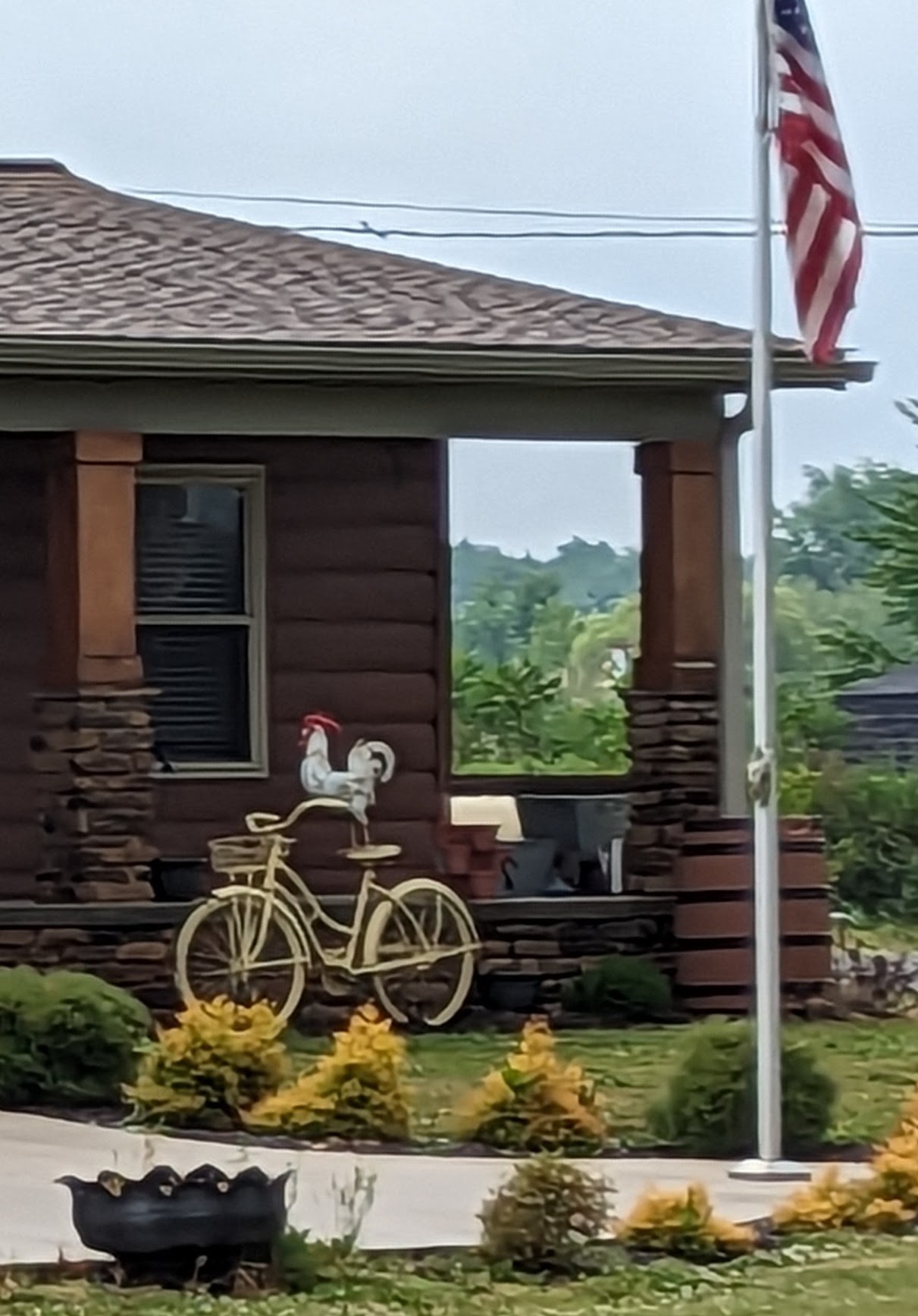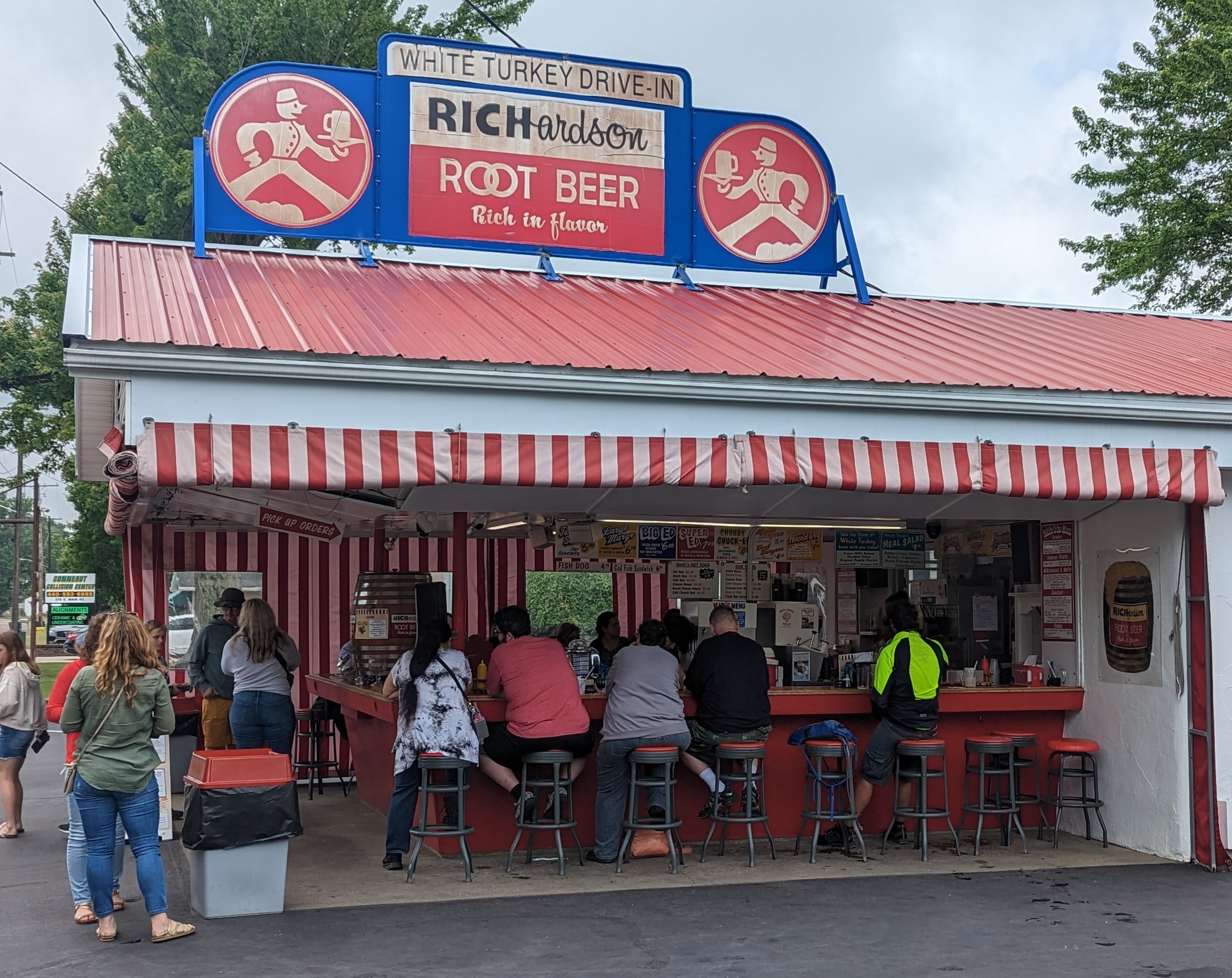 It was only the second day we started out in the rain. It rained steadily this morning, stopped long enough for some people to take off their rain gear, and then poured with some scattered hail which hit Chad but not me. It cleared for good at the White Turkey Drive-In, a perennial favorite for turkey sandwiches and root beer floats.