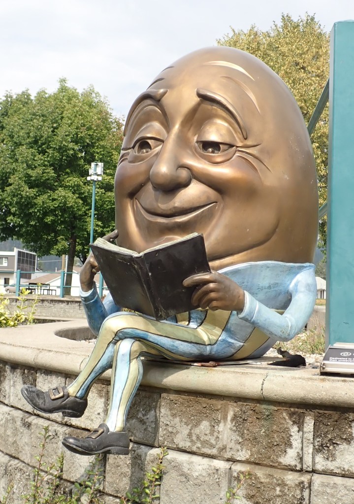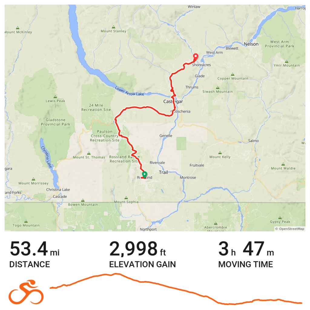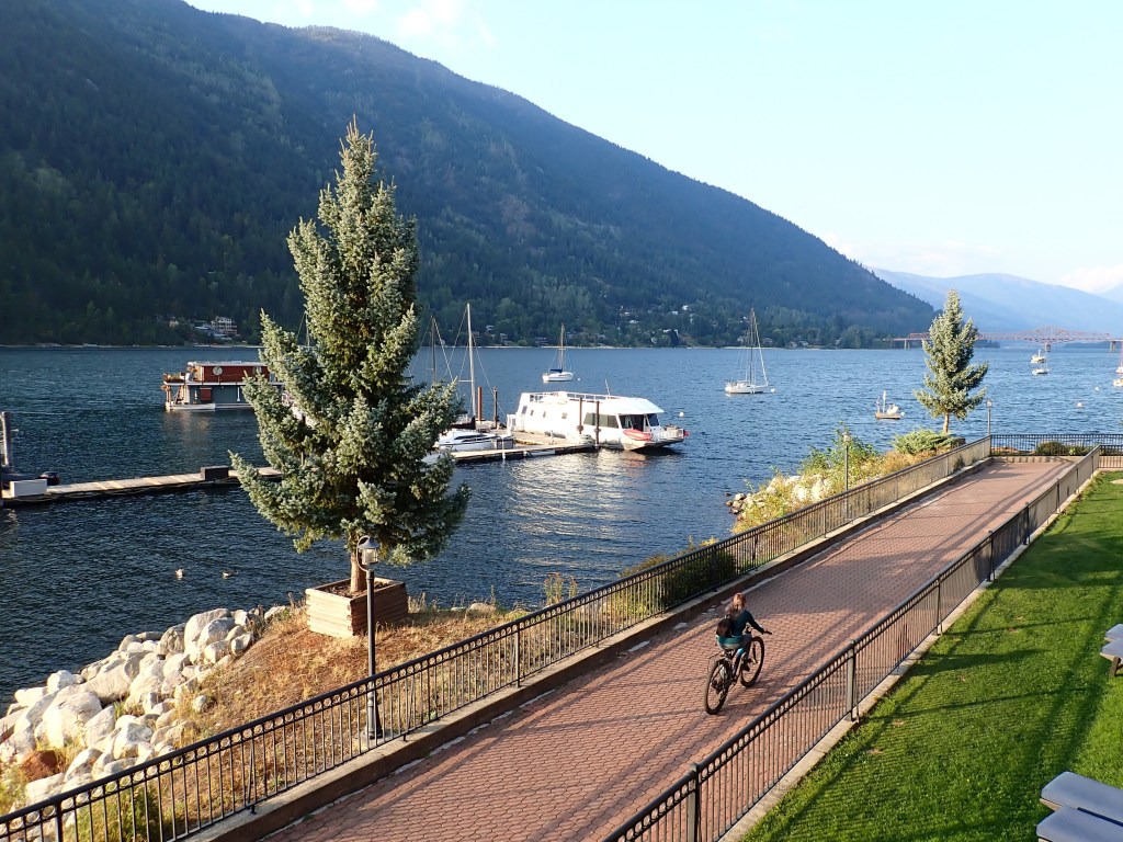 Day 2 started with a long, fairly steep climb out of Rossland, 1700′ over 14 miles. After the summit we were stopped for 15 minutes by road work, but we were rewarded with miles of steady downhill on buttery smooth fresh blacktop with no traffic at all. Believe me, it was great, even if it doesn’t sound like much to a non-cyclist. We arrived in the town of Castlegar for lunch. Castlegar sits at the confluence of the Kootenay and Columbia rivers, set deep into towering rocks. It also bills itself as the sculpture capital of Canada, so there are lots of sculptures all over town. Unfortunately, one of our riders took a hard fall entering the town, suffering a fractured pelvis and a wrist fracture which will require an open repair. There’s always that risk. From there we had a steep climb up those towering rocks before proceding to Nelson. Nelson is a nice little town on the Columbia. We ate at a local farm-to-table restaurant. They bend the rules a little to serve chocolate for dessert, even though it’s hardly local to BC.