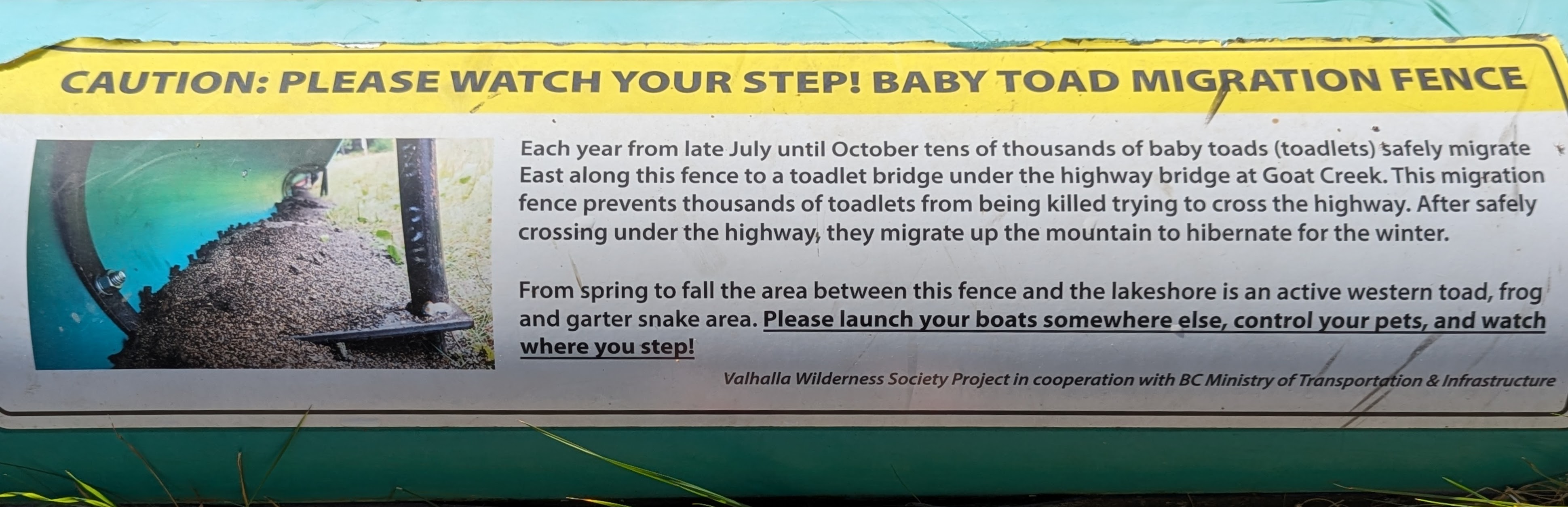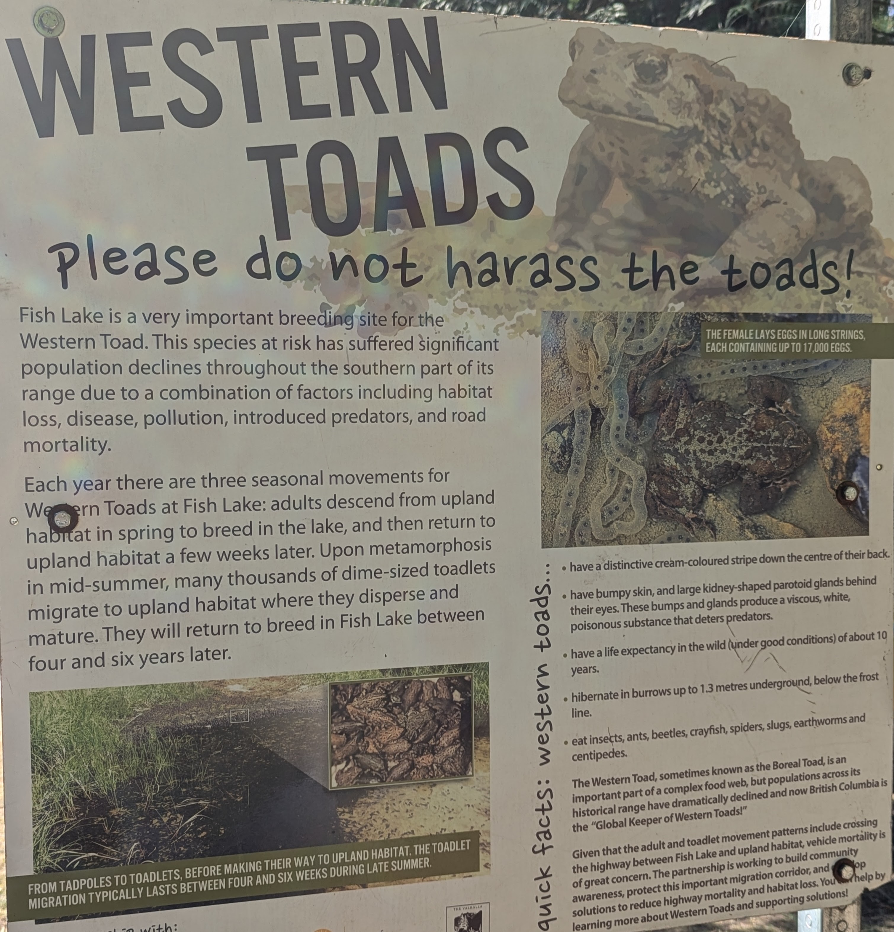 And then the toads. Fish Lake is a breeding site for the Western Toad. The adult toads come down from the highlands in the spring, lay eggs, and go back up a few weeks later. When the tadpoles metamorph into toads in midsummer they too head for the hills. Many die in the process, especially crossing the road. Think of the old video game, Frogger. The female lays as many as 17,000 (!) eggs at a time, but that’s apparently not enough to overcome enhanced natural selection. To help the toads they’ve built halfpipes to direct them away from the highway to a creek where they can safely cross the road.