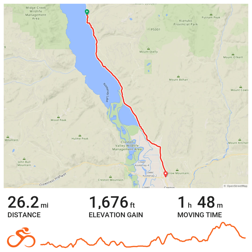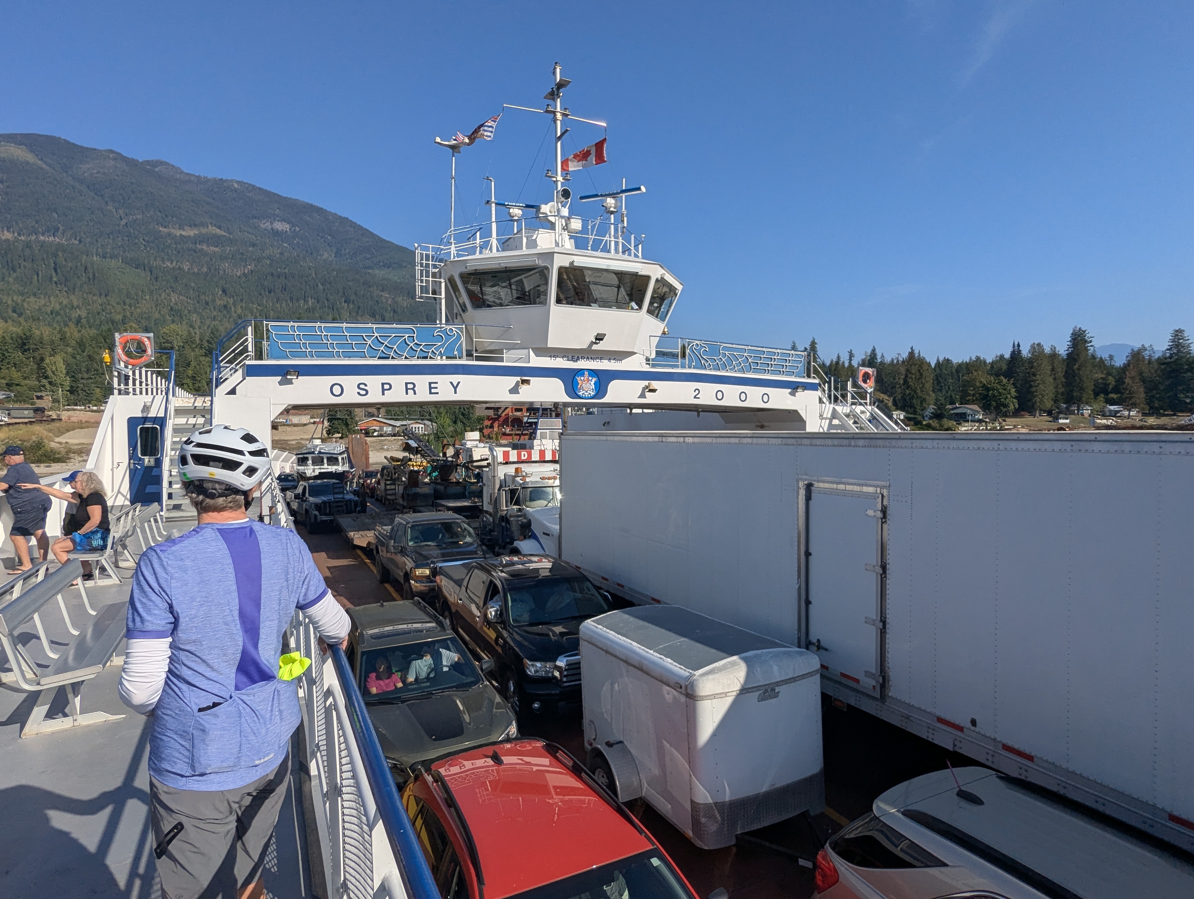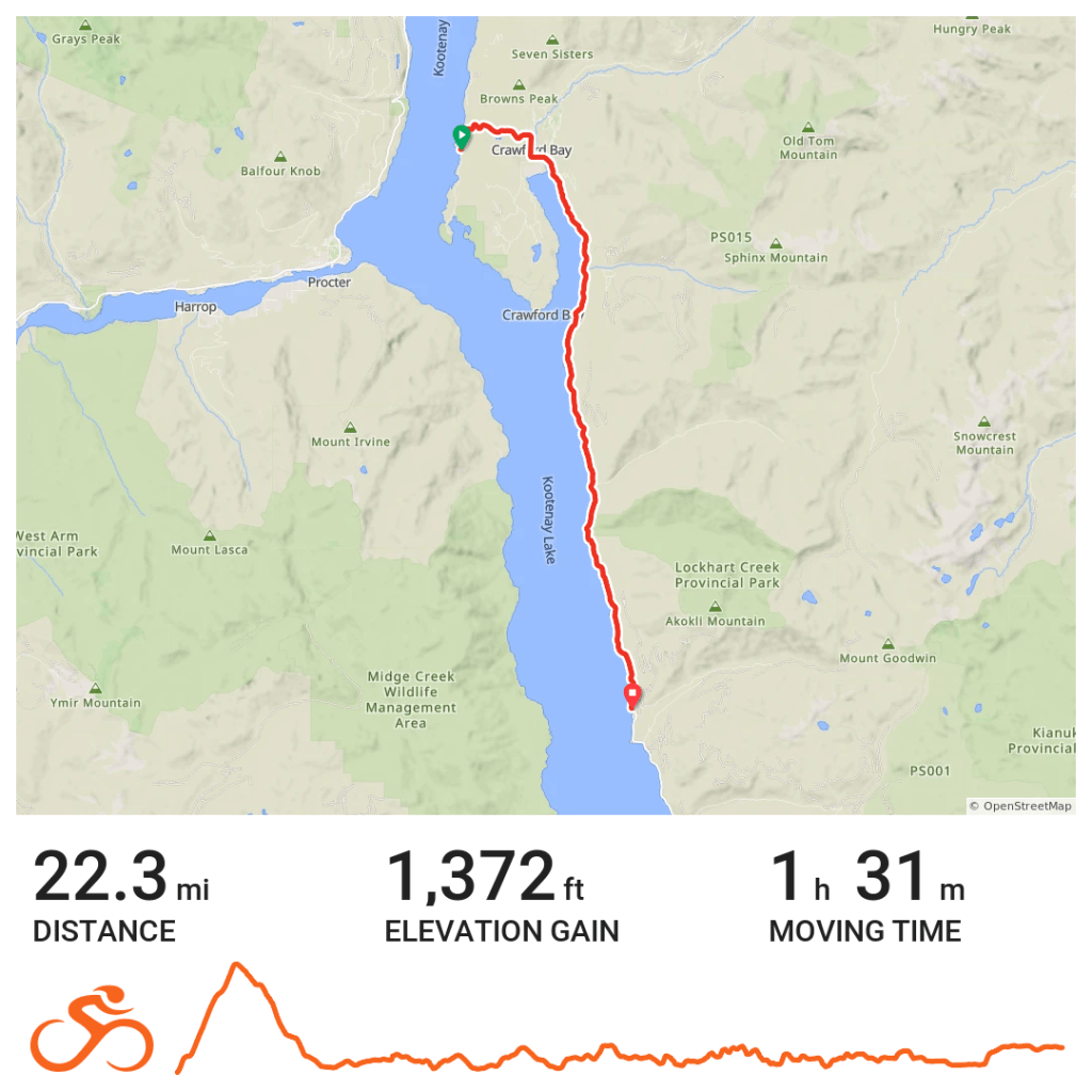 Today started with van ride to the town of Balfour where we boarded a ferry to cross the lake. I’ve been on both larger and smaller ferries, but never on a bicycle. We crossed the narrow part of the lake, but that was still a 35 minute trip. The lake is 64 miles long, after all.